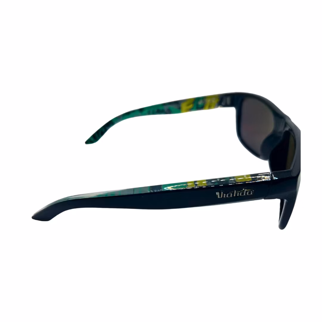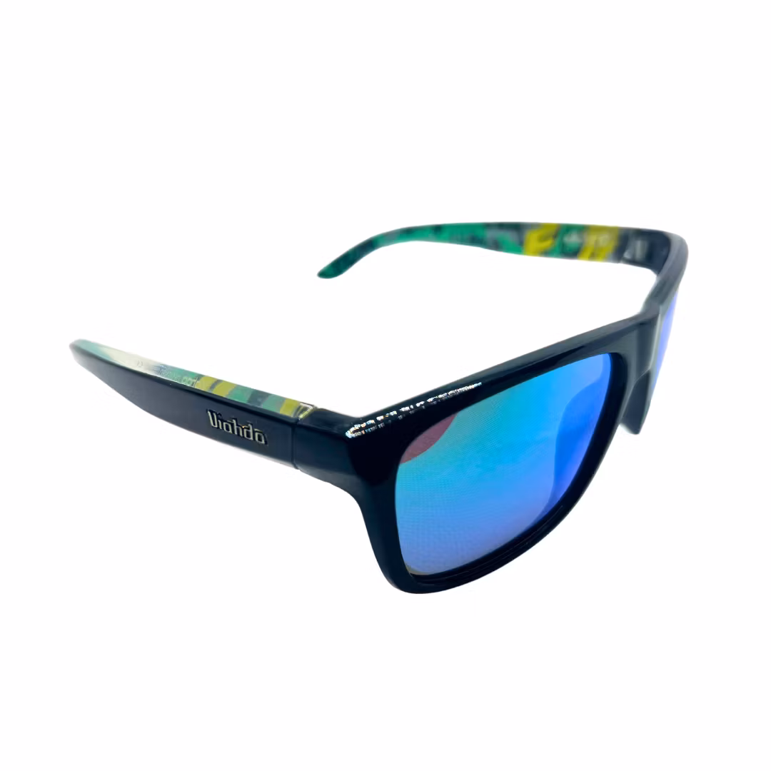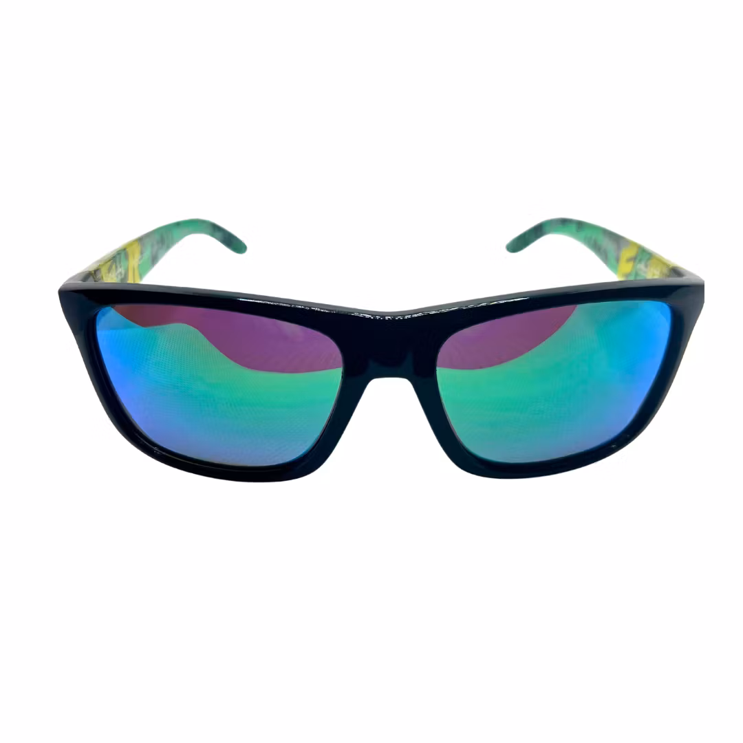 Disse solbrillene skriker attitude og stil! Med speilglass i blått og grønt, en klassisk sort ramme og en overraskende transparent innside med mønster, får du det beste av både funksjon og design.